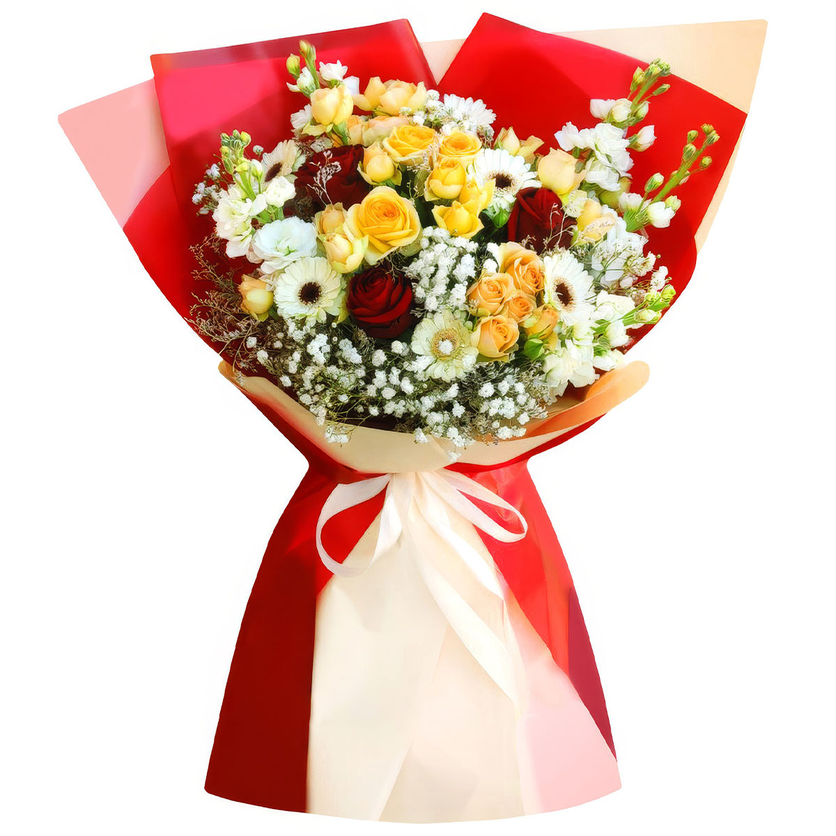 Роза одноголовая красная, роза кустовая желтая, маттиола белая, гербера мини белая, гипсофила, лимониум. Упаковка (лента, пленка, крафт, сетка, пленка матовая)