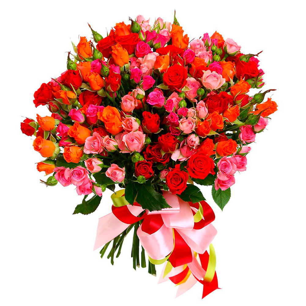 Роза кустовая пышний микс (розовая, красная, оранжевая). Упаковка (лента, пленка, крафт, сетка, пленка матовая)