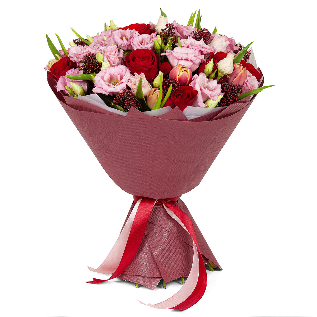 Роза одноголовая красная, тюльпан розовый, эустома розовая, озотамнус. Упаковка (лента, пленка, крафт, сетка, пленка матовая)