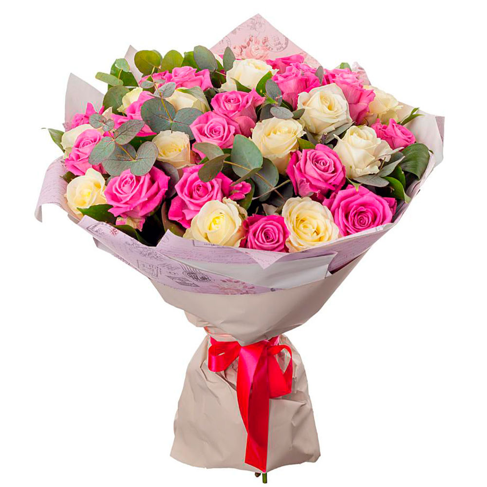 Роза одноголовая микс (кремовая, розовая), эвкалипт. Упаковка (лента, пленка, крафт, сетка, пленка матовая)
