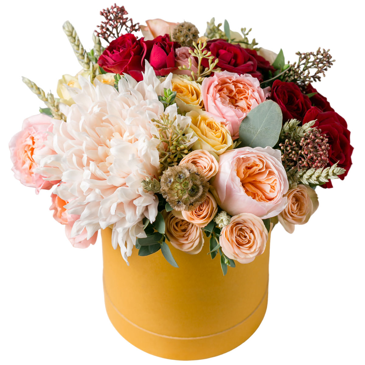 Пион кремовый, роза пионовидная персиковая, роза одноголовая красная, роза кустовая жёлтая, скабиоза сухоцвет, колос. Упаковка (шляпная коробка, квадратный бокс, коробка сердце, оазис)
