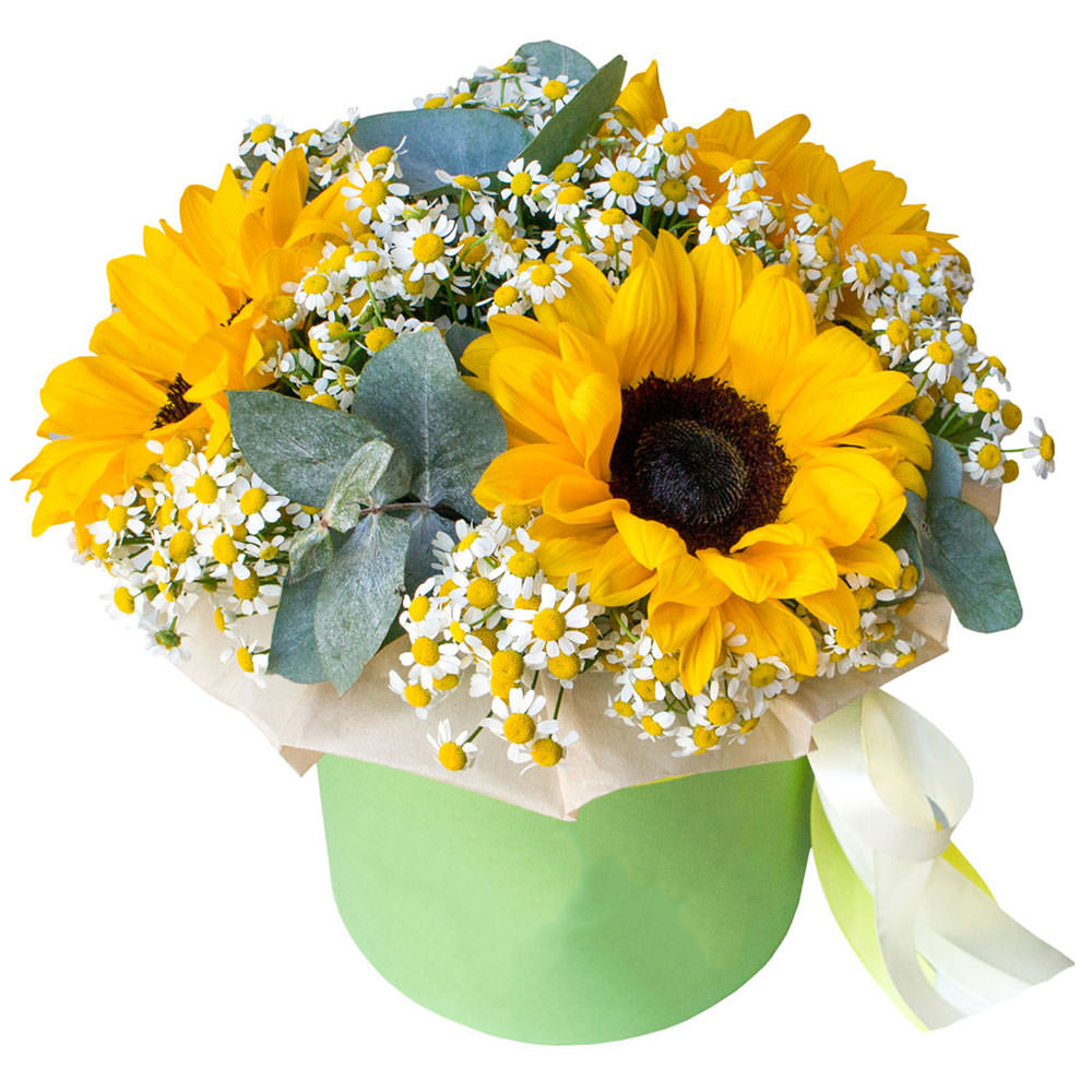 Цветы в коробке «Солнечный день» с доставкой по г Гурьевск (Кемеровская обл): вы можете купить букет в цветочном салоне «Флормания» по цене от 3290 руб.