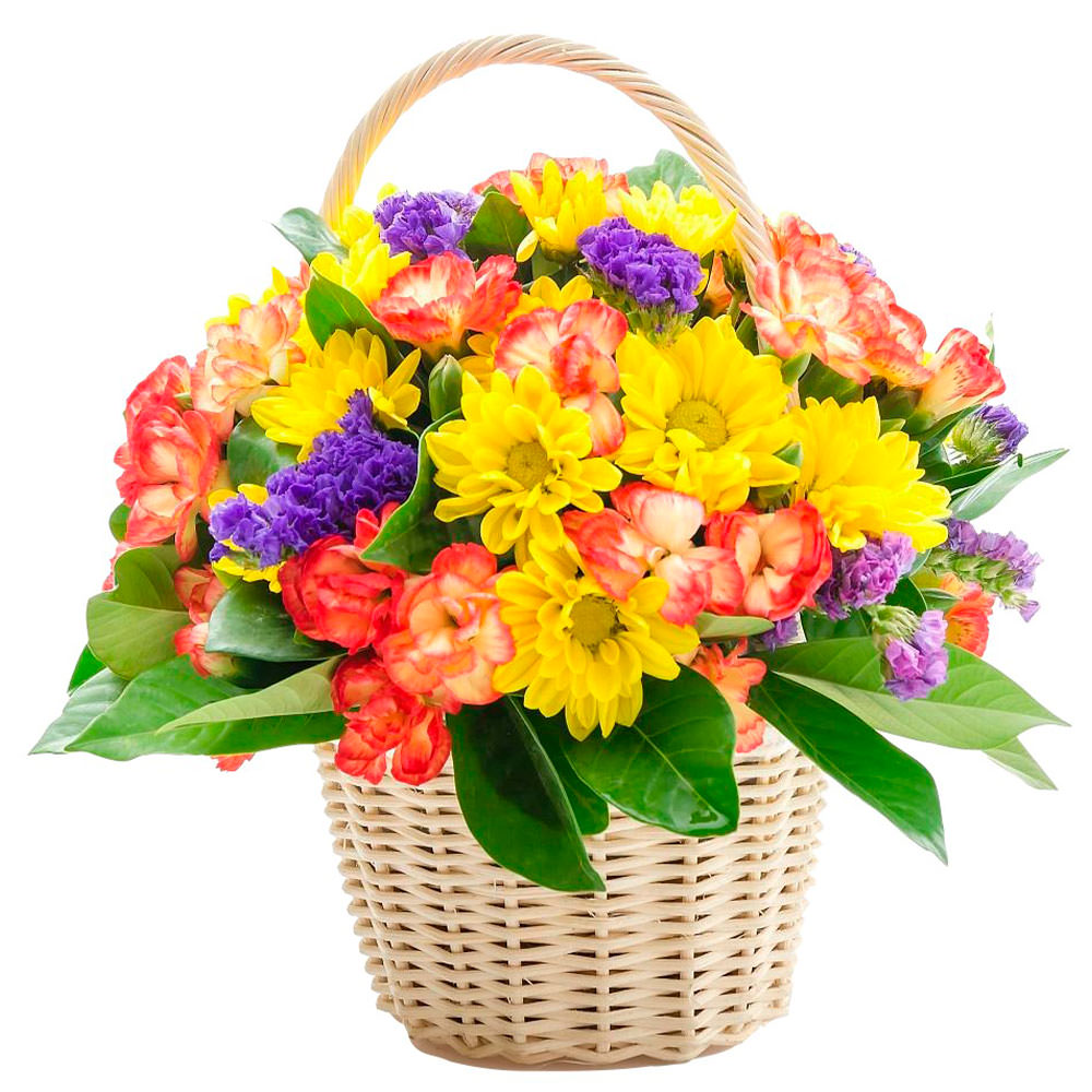 Хризантема кустовая желтая, лимониум, гвоздика кустовая оранжевая. Упаковка (Корзина, оазис).