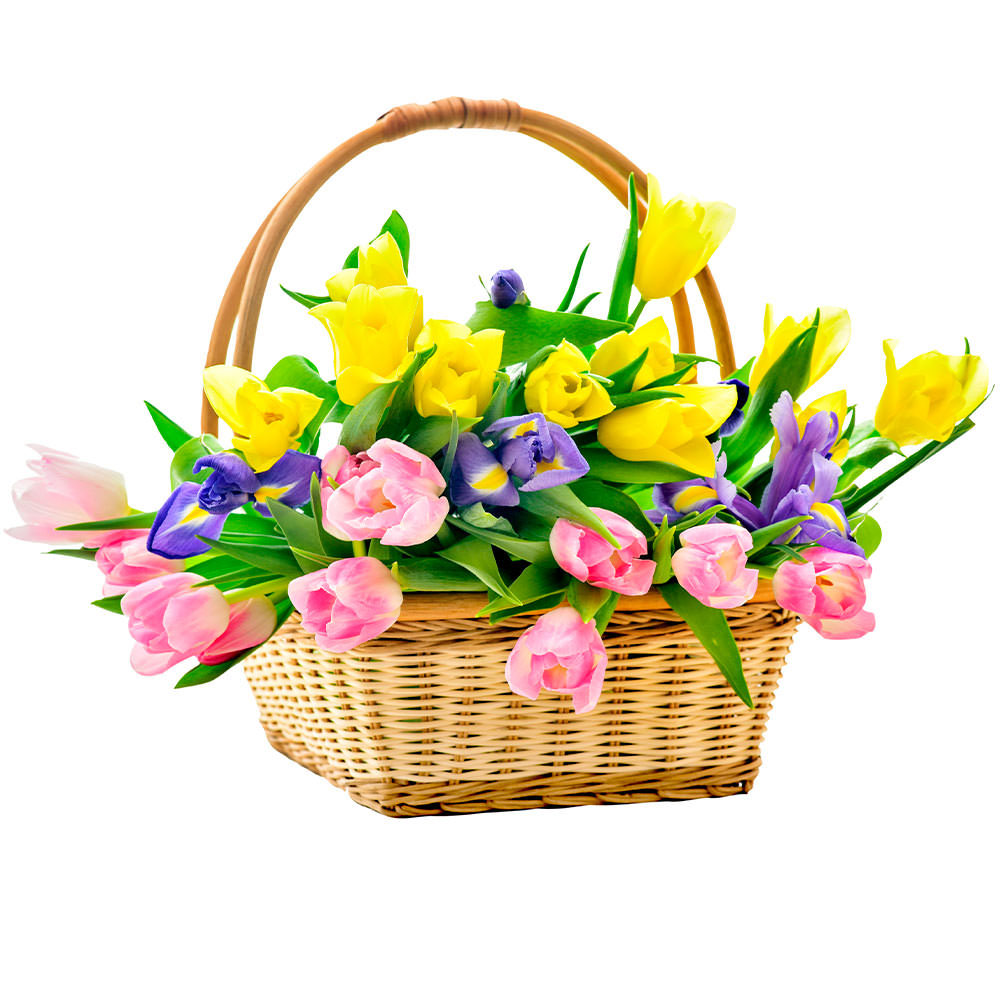 Тюльпаны микс (желтый, розовый), ирис. Упаковка (Корзина, оазис).